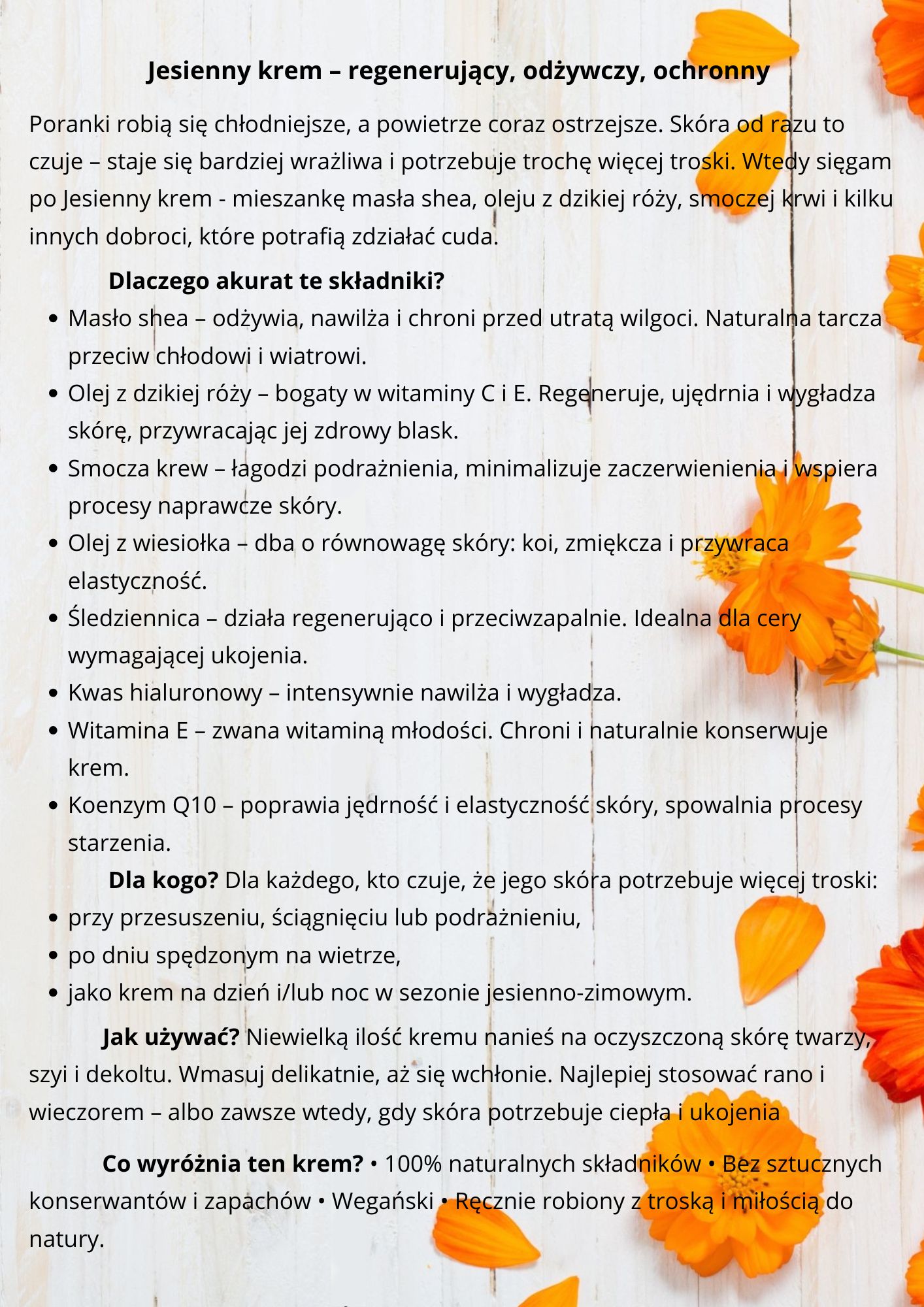 Gdy poranki stają się chłodniejsze, a powietrze coraz ostrzejsze, skóra szybko daje znać, że potrzebuje więcej czułości. Jesienny krem to odpowiedź na te potrzeby – bogata, naturalna mieszanka maseł i olejów, stworzona z myślą o skórze wymagającej ukojenia, regeneracji i solidnej porcji odżywienia. Krem idealny na przesuszenie, podrażnienia i jesienno-zimową pielęgnację.