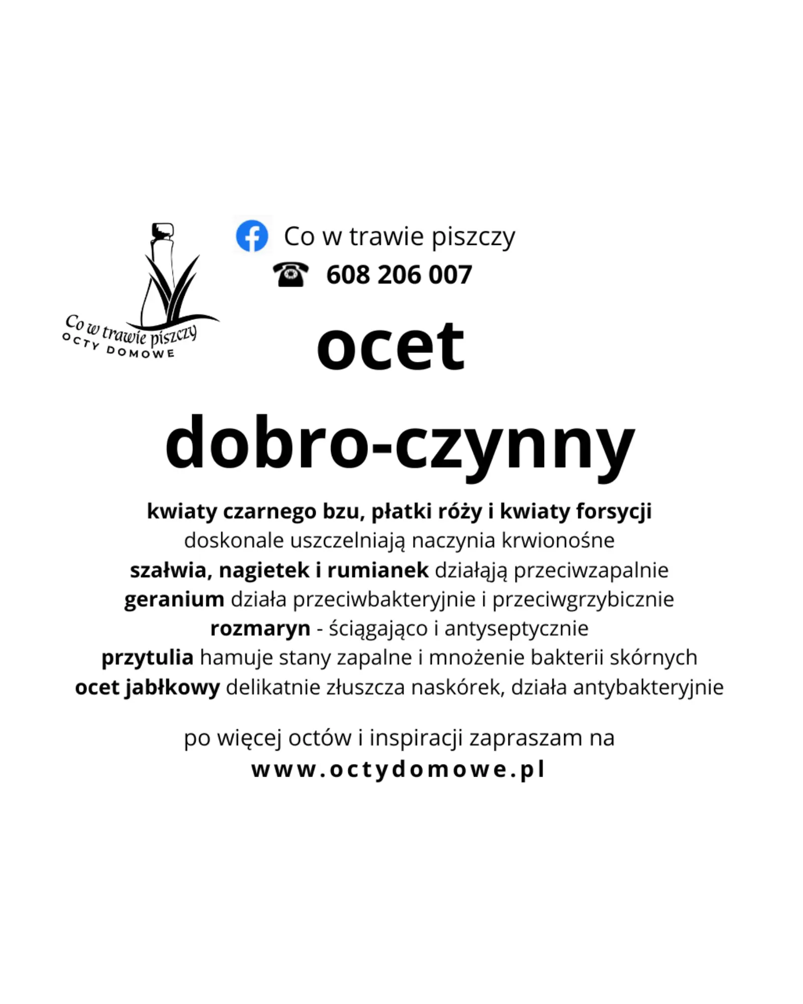 Ten produkt był dla mnie prawdziwym błyskiem olśnienia. Od razu wiedziałam, że musi nazywać się Ocet Dobro-czynny. Jego głównym zadaniem jest po prostu czynienie dobra – na wielu poziomach jednocześnie.Stworzyłam go tak, by działał holistycznie: wspierał Twoje wnętrze oraz pielęgnował urodę. To nie jest zwykły produkt z taśmy produkcyjnej. Bazą jest mój autorski, żywy ocet jabłkowy, który fermentuję tradycyjną metodą. Wszystkie zioła i kwiaty, które w nim znajdziesz, zbieram osobiście z dala od dróg i zanieczyszczeń. Dzięki temu mam pewność, że oddaję w Twoje ręce czystą esencję natury.
