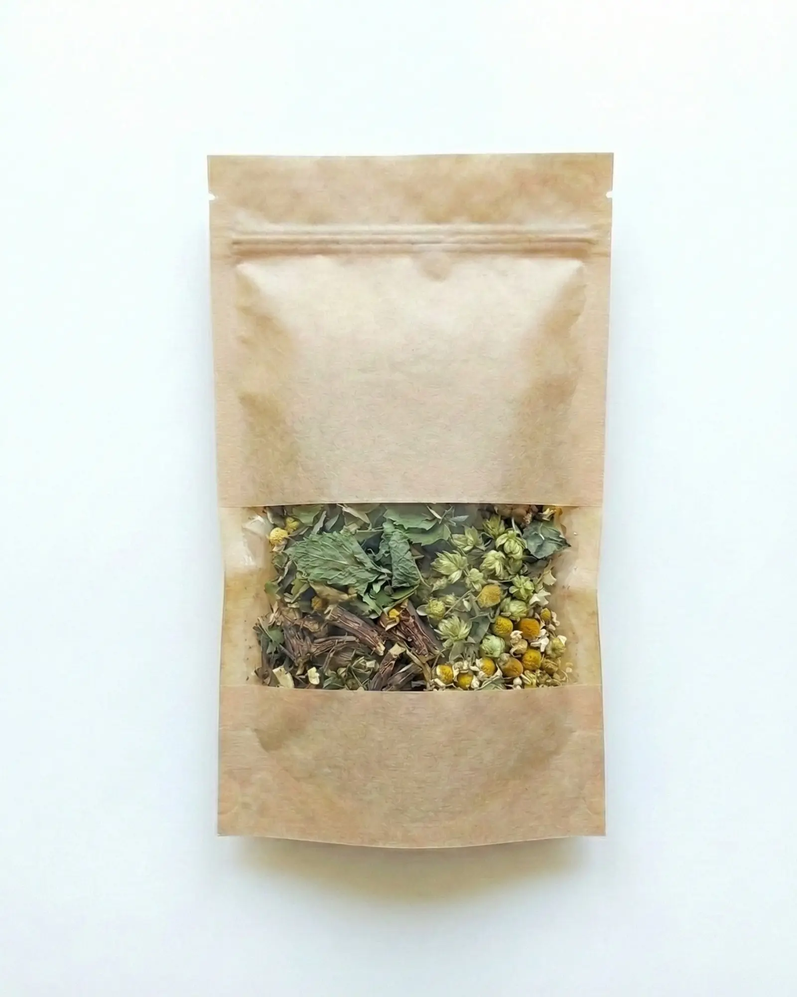 Papierowe opakowanie z okienkiem prezentujące suszoną mieszankę ziół: rumianek, melisę, miętę, szyszki chmielu i kozłek lekarski.
