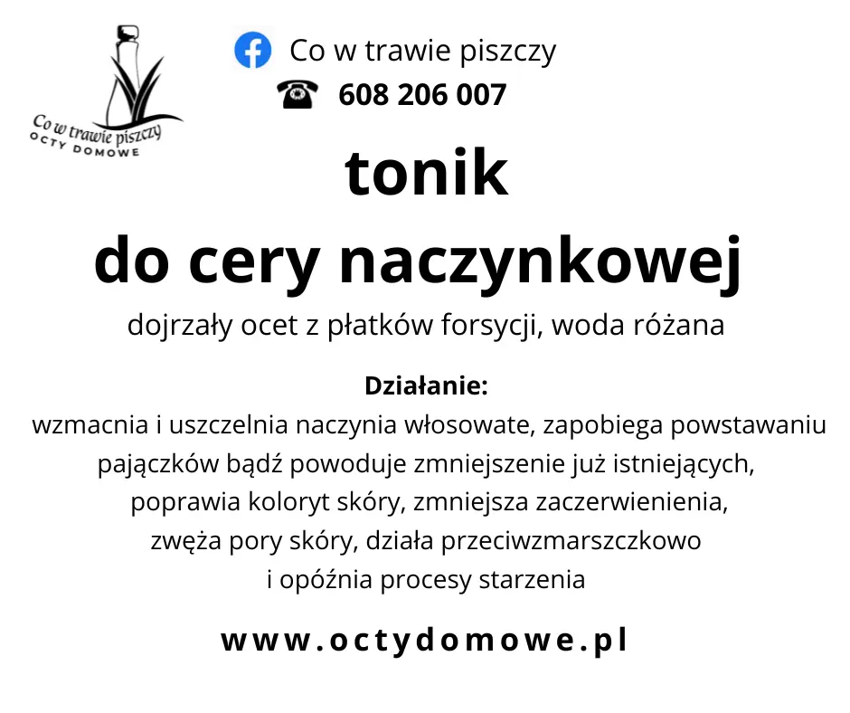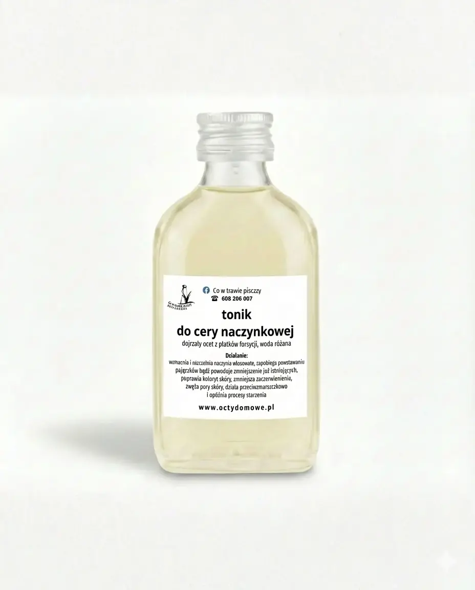 To nie jest zwykły tonik z fabryki. Jego sercem jest żywy ocet z forsycji, który przygotowuję ręcznie tradycyjną metodą fermentacji. Ponadto, dopełniłam go najczystszym hydrolatem z róży. Dzięki temu połączeniu Twoja skóra otrzymuje to, co w naturze najskuteczniejsze w walce z pajączkami. Chociaż bazą jest ocet, tonik jest niezwykle łagodny dla Twojej delikatnej skóry.